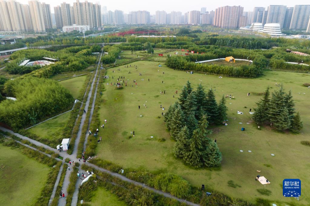 10月7日,市民在西安雁南公園內游玩(無(wú)人機照片)。