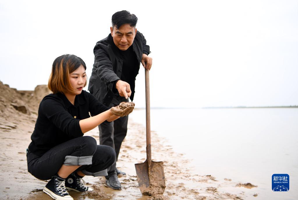 10月7日,在黃河河南洛陽(yáng)段,游曉曉(左)捧起黃河泥,觀(guān)察泥土細膩度。