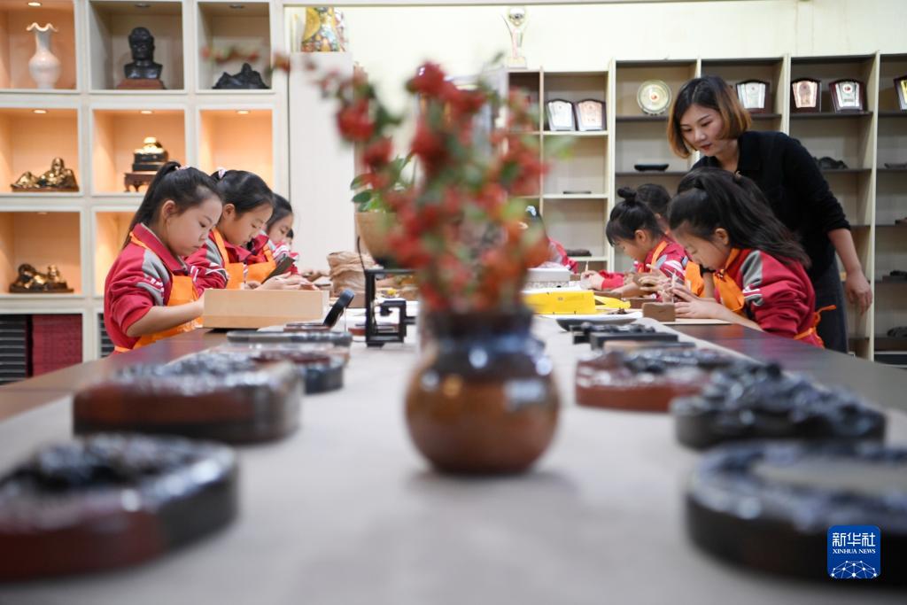 10月7日,在河南省洛陽(yáng)市新安縣河洛澄泥硯藝術(shù)館,游曉曉在教小學(xué)生制作澄泥硯。