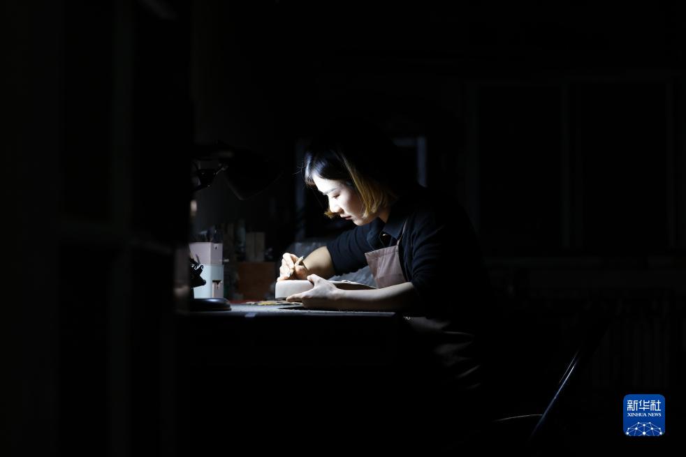 10月7日,游曉曉在工作室內雕刻硯坯。