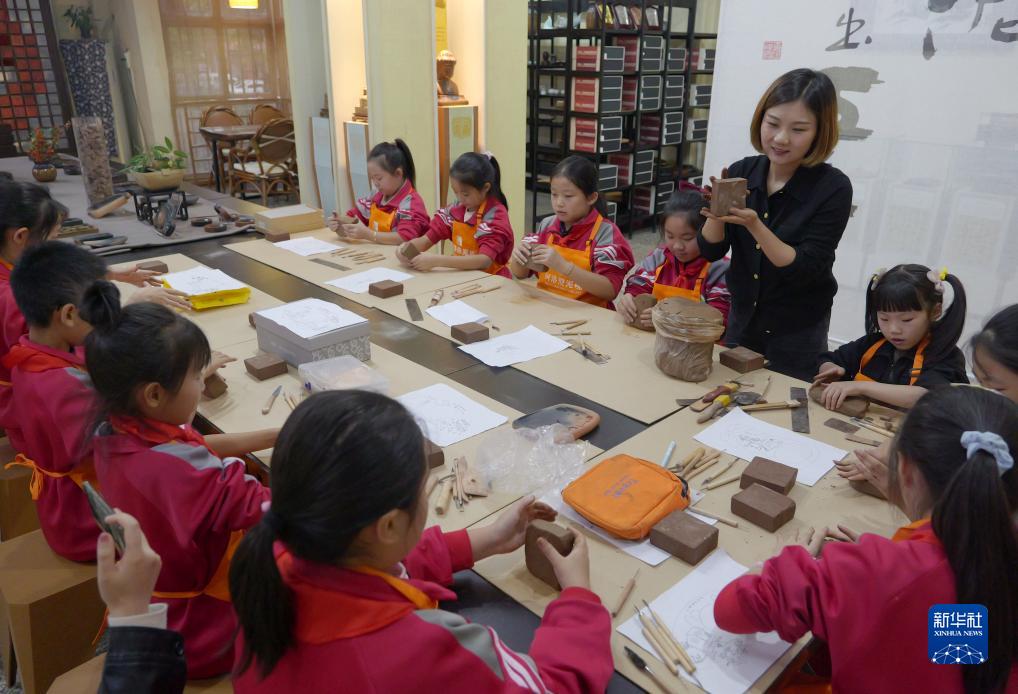 10月7日,在河南省洛陽(yáng)市新安縣河洛澄泥硯藝術(shù)館,游曉曉在教小學(xué)生制作澄泥硯。