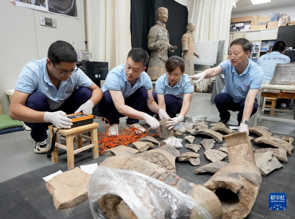 秦始皇帝陵博物院文物修復專(zhuān)家蘭德?。ㄓ乙唬┰谥笇Ъ夹g(shù)人員運用超聲波儀器測量秦俑胎體的密度(8月23日攝)。