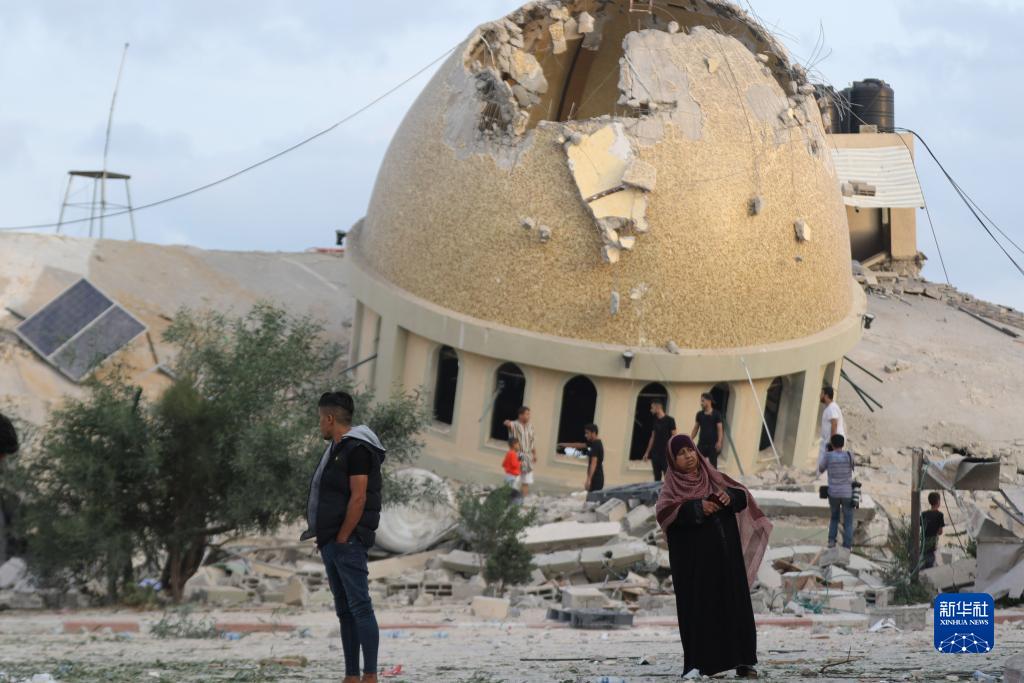 10月8日,在加沙地帶南部城市汗尤尼斯,人們站在一座被以色列空襲炸毀的清真寺旁。