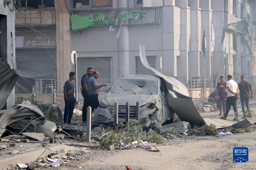 10月8日,在加沙城,巴勒斯坦人查看被以色列空襲炸毀的汽車(chē)。