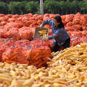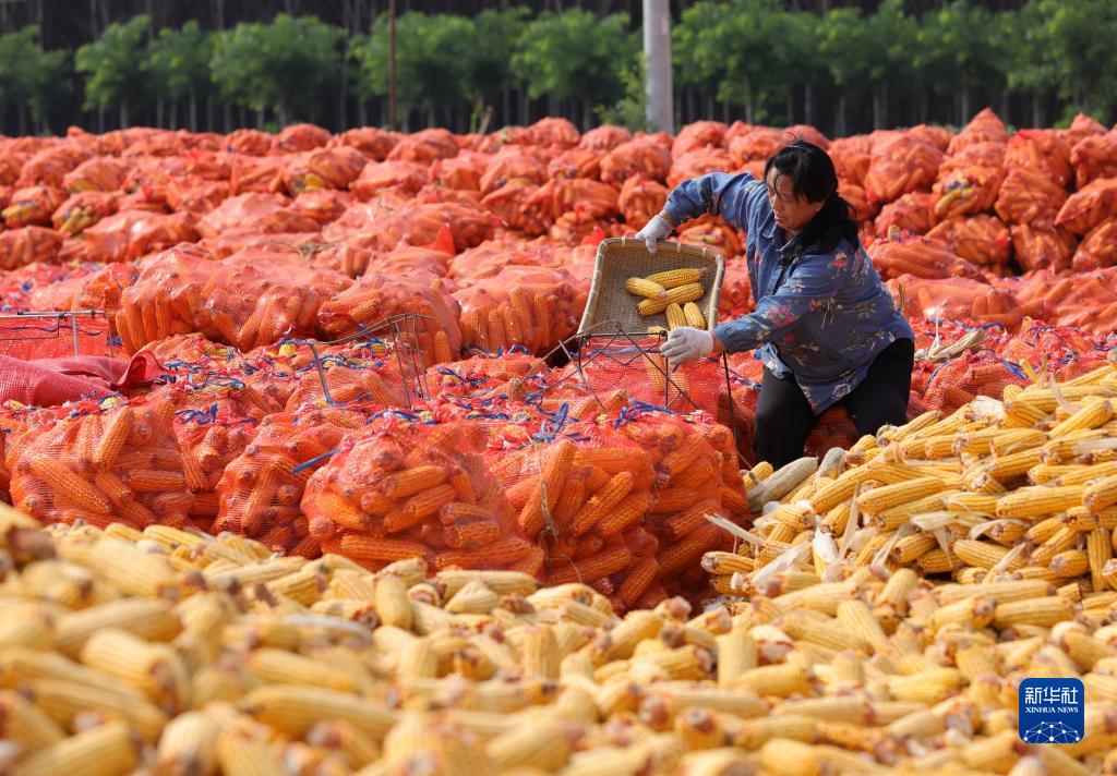 10月8日,河北省邢臺市廣宗縣北淤疃村村民在整理收獲的玉米。