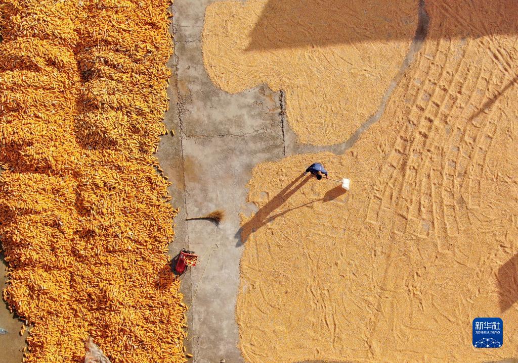 10月8日,在山東省臨沂市平邑縣地方鎮順河莊村,農民在晾曬收獲的玉米(無(wú)人機照片)。