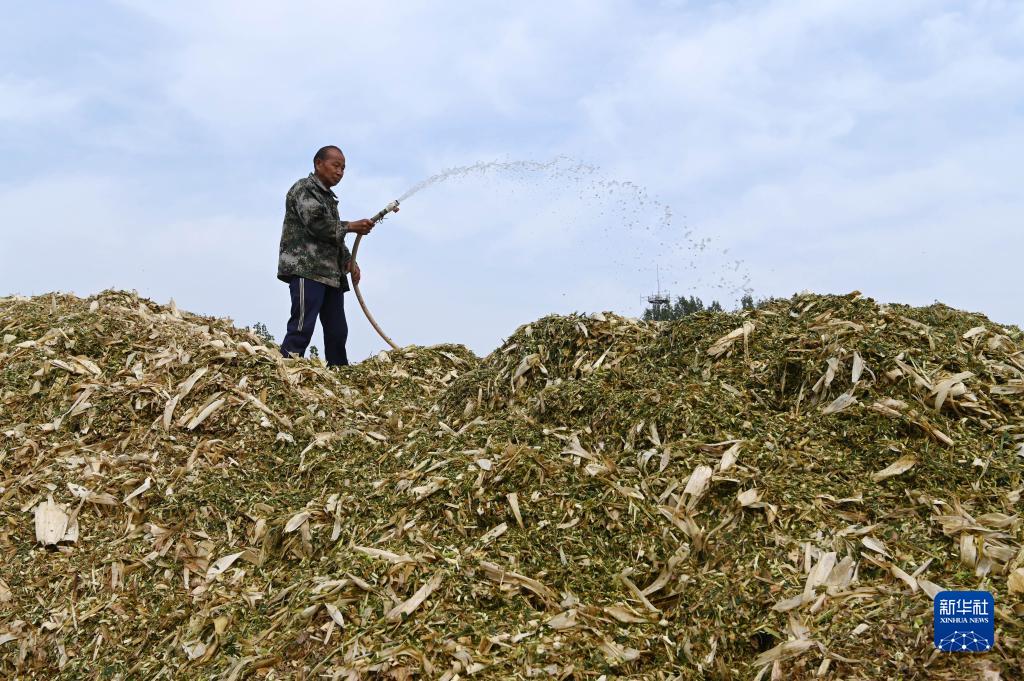 10月8日,在河南省沁陽(yáng)市柏香鎮南王村,一家種植專(zhuān)業(yè)合作社社員為回收的玉米秸稈噴水。