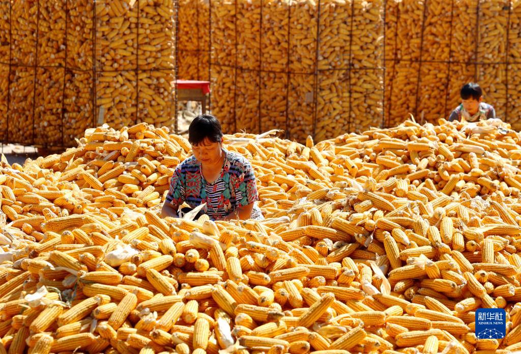 10月9日,河北省晉州市周家莊鄉的農民將收獲的玉米剝皮。