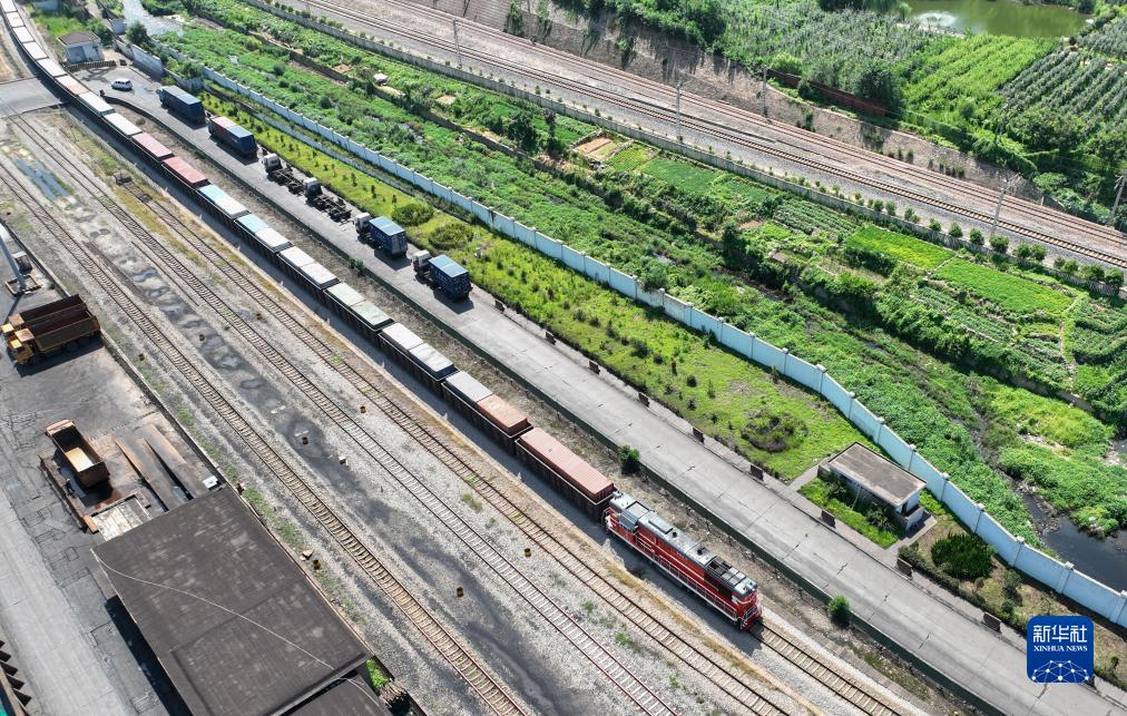 4月28日,一列中歐班列從中哈連云港物流合作基地駛出(無(wú)人機照片)。