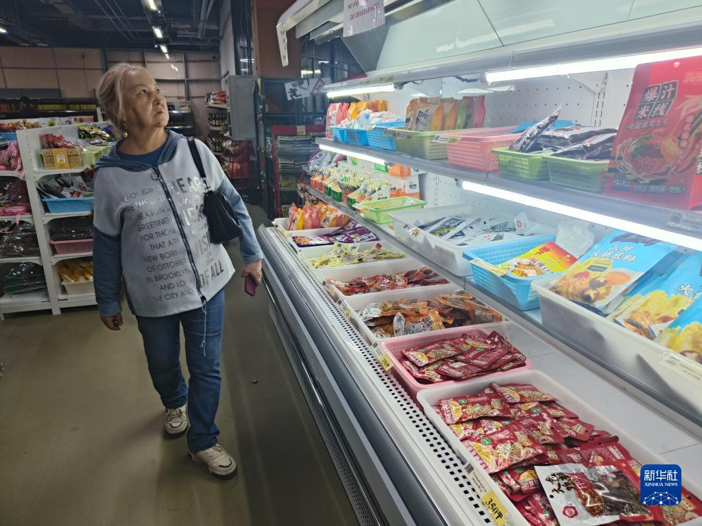 5月9日,顧客在哈薩克斯坦阿拉木圖市一家中國商品超市內選購商品(手機照片)。