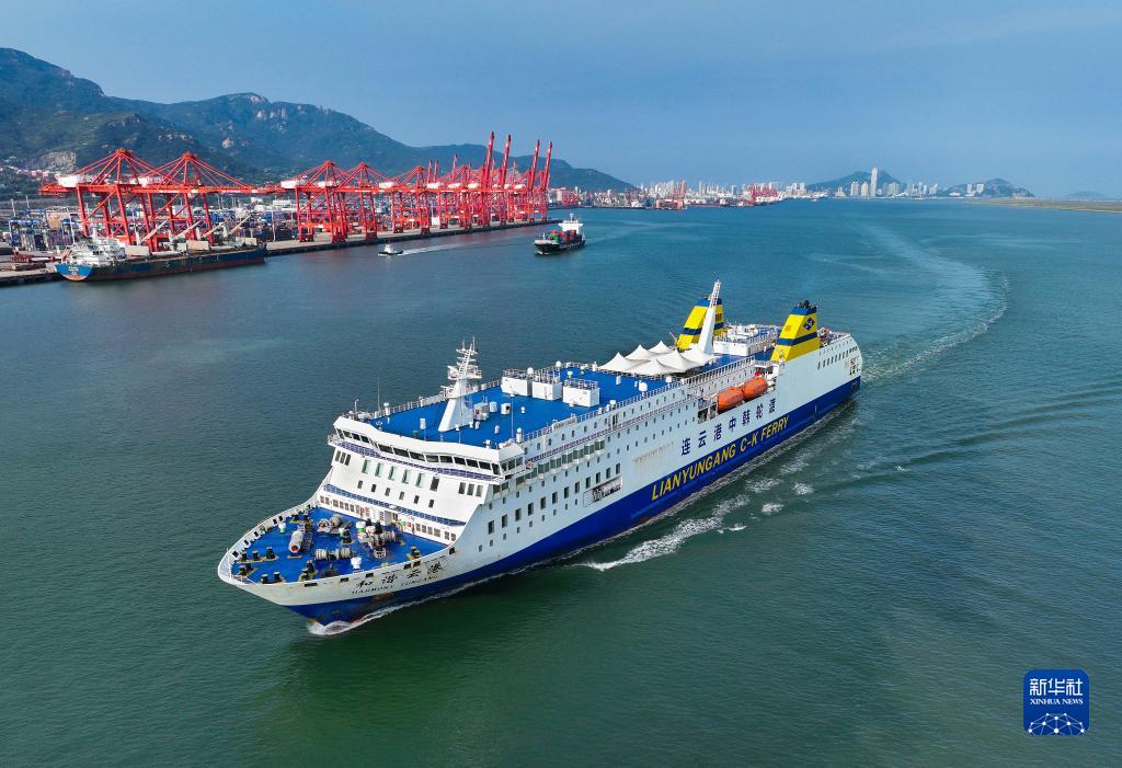 2022年9月7日,一艘遠洋輪船從江蘇連云港港駛出(無(wú)人機照片)。