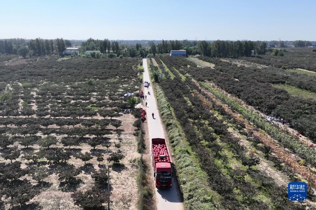 10月9日,貨車(chē)在河北省清河縣馬屯紅果種植專(zhuān)業(yè)合作社山楂林內運輸山楂(無(wú)人機照片)。