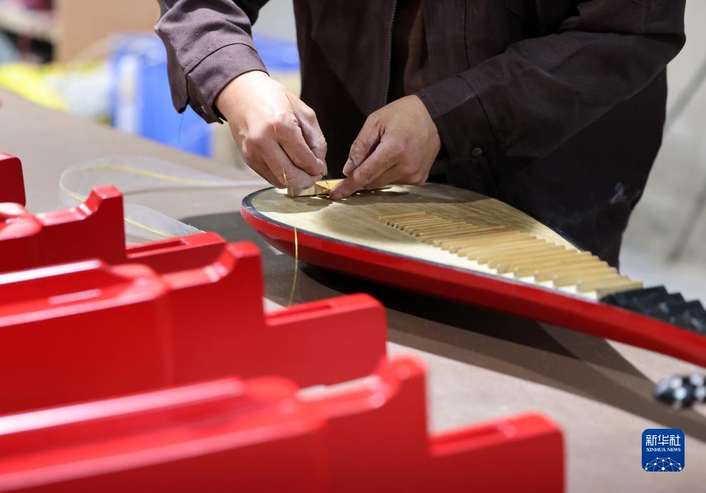 10月9日,河南省蘭考縣堌陽(yáng)鎮一家樂(lè )器廠(chǎng)的工作人員在調試樂(lè )器。