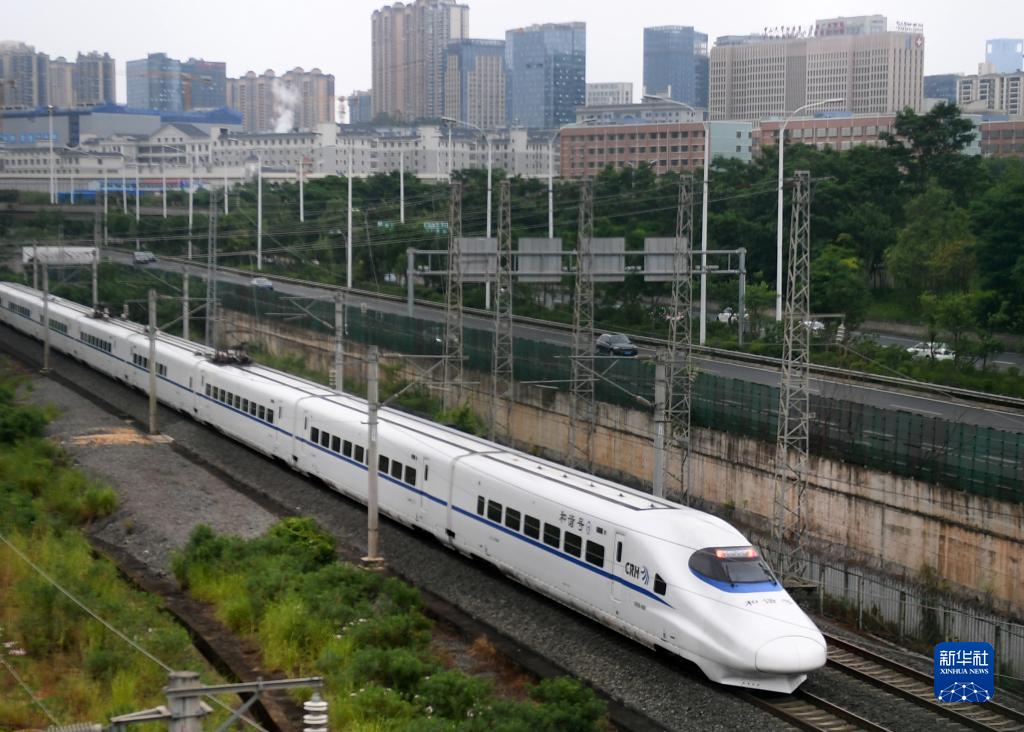10月10日,一列動(dòng)車(chē)組在廣西南寧市區內行駛。
