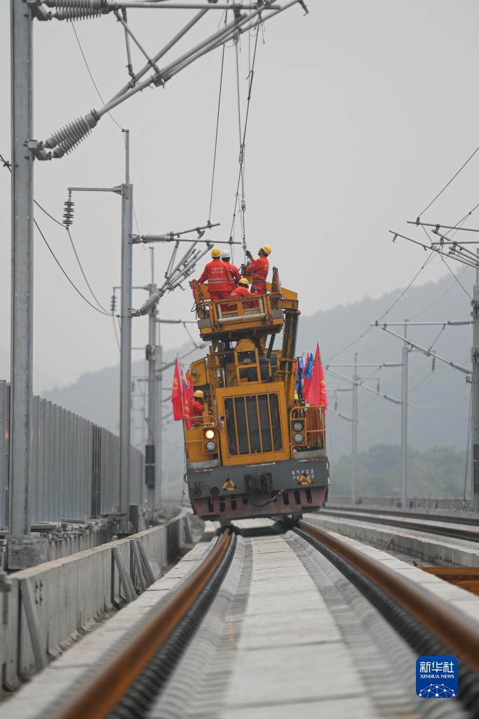 10月10日,中國中鐵電氣化局施工人員在杭溫鐵路上進(jìn)行接觸網(wǎng)導線(xiàn)架設作業(yè)。