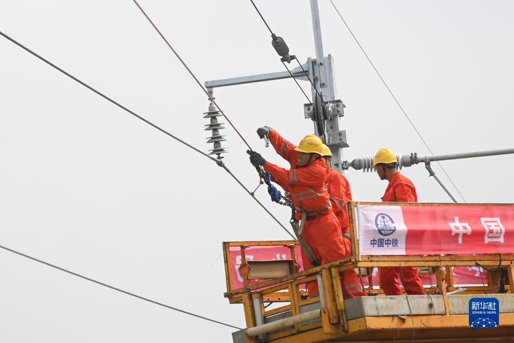 10月10日,中國中鐵電氣化局施工人員在杭溫鐵路上進(jìn)行接觸網(wǎng)導線(xiàn)架設作業(yè)。