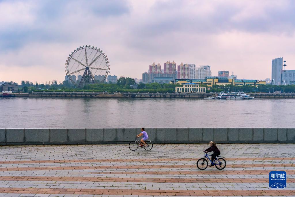 7月24日,兩位女子在俄羅斯布拉戈維申斯克市河堤上騎自行車(chē)。對岸就是中國黑河市。