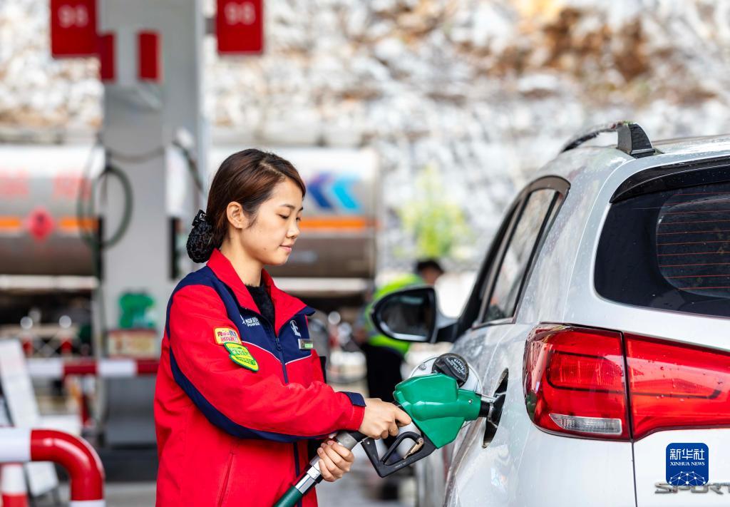 10月10日,貴州省黔西市一加油站的工作人員在為汽車(chē)加油。