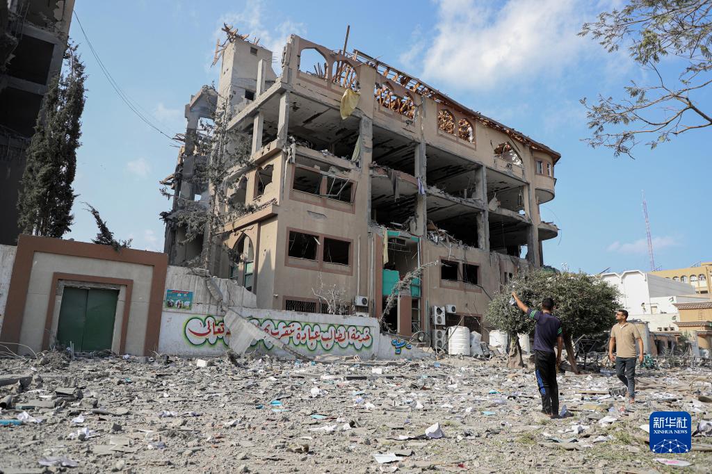 10月10日,在加沙城,人們走過(guò)被以色列空襲炸毀的建筑廢墟。