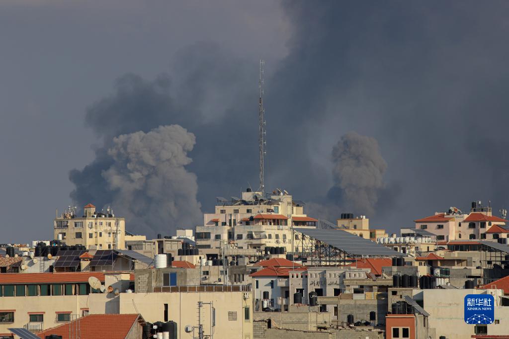 10月10日,加沙城的建筑遭以色列空襲后升起濃煙。