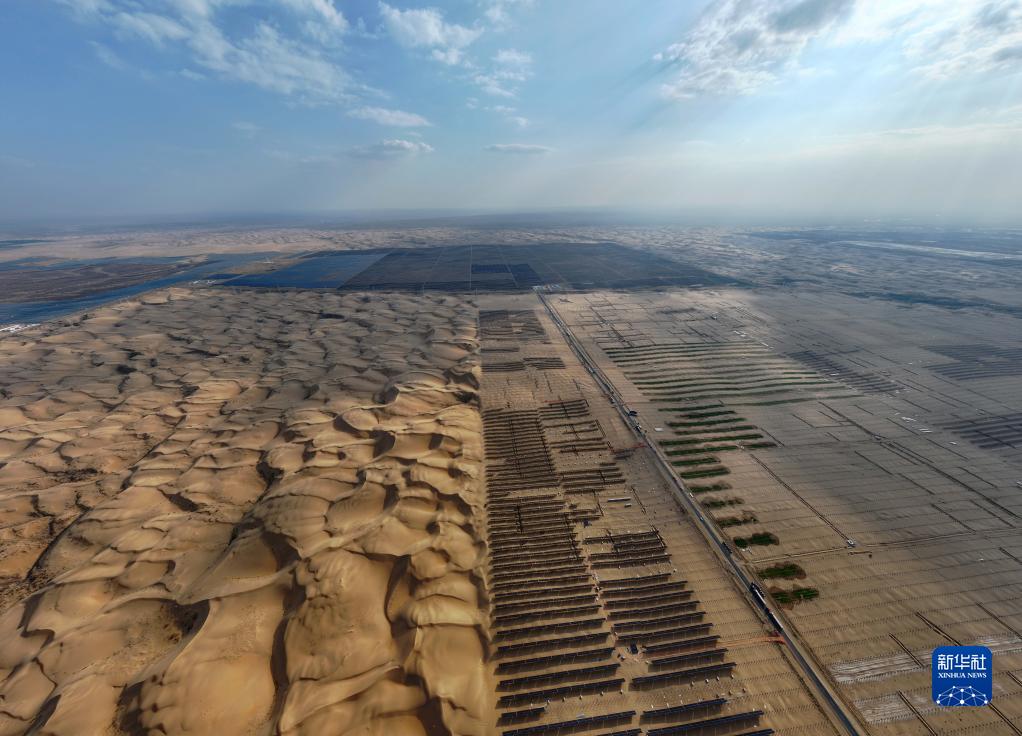 這是10月10日拍攝的建設中的庫布其沙漠鄂爾多斯中北部新能源基地(無(wú)人機合成照片)。