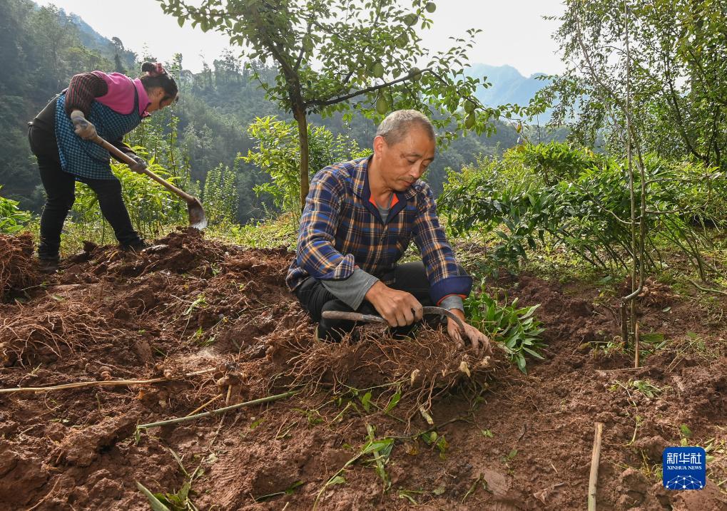 10月10日,在重慶市石柱土家族自治縣中益鄉華溪村,村民在種植園內收獲黃精。