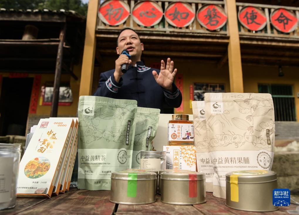 10月10日,重慶市石柱土家族自治縣中益鄉鄉長(cháng)隆鳳翔在華溪村初心小院介紹黃精產(chǎn)品。