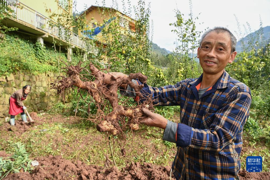10月10日,在重慶市石柱土家族自治縣中益鄉華溪村,村民展示剛剛從地里挖出的黃精。