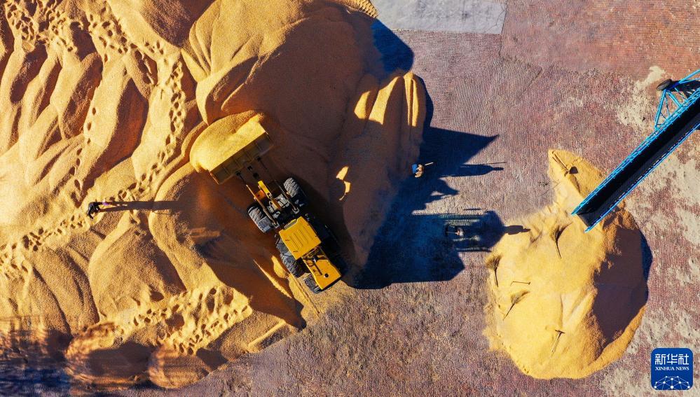 在內蒙古通遼市奈曼旗新鎮舍布日圖嘎查,工人在收糧站晾曬玉米(2022年10月18日攝,無(wú)人機照片)。