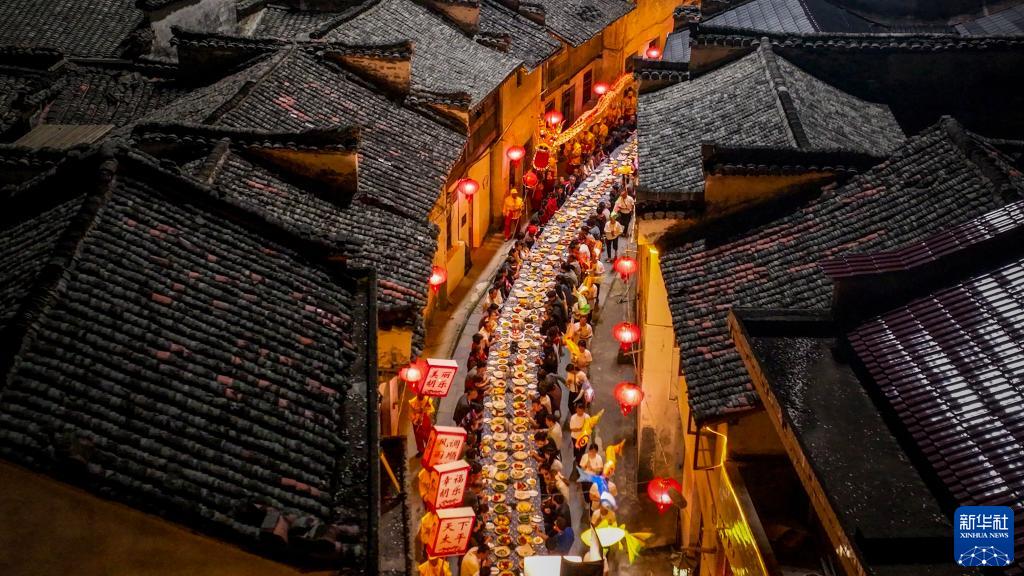村民舞著(zhù)龍燈經(jīng)過(guò)安徽省寧國市胡樂(lè )鎮老街上舉辦的長(cháng)桌宴(2023年6月16日攝,無(wú)人機照片)。