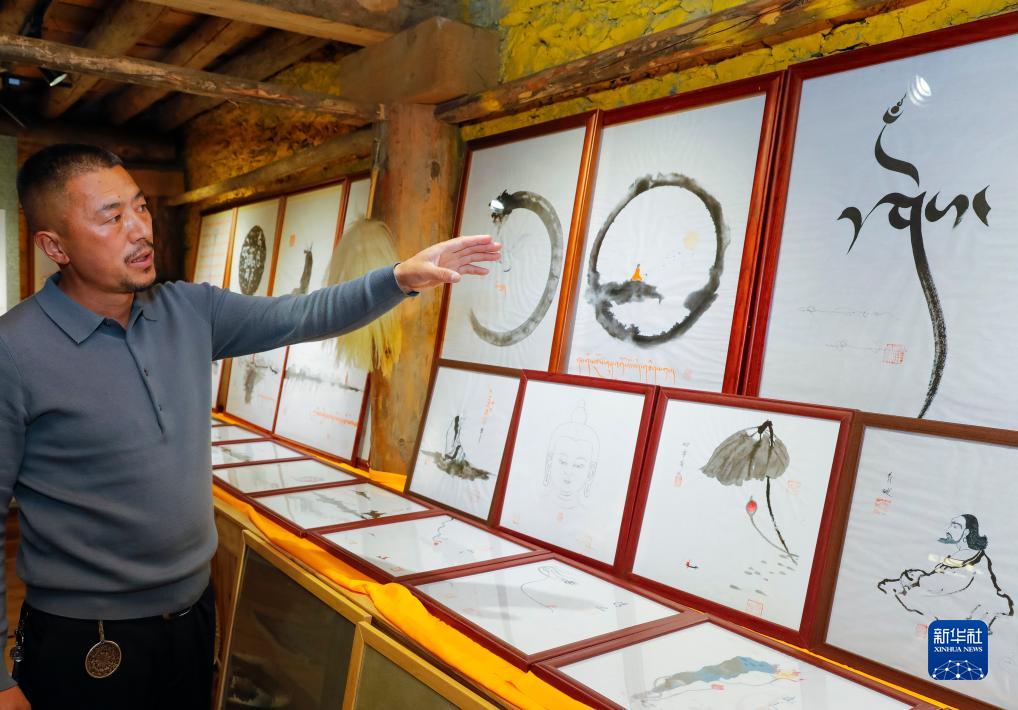 10月10日,在四川甘孜藏族自治州理塘縣,藏族書(shū)法家昂旺曲批展示其將藏文書(shū)法與傳統水墨畫(huà)相結合創(chuàng )作的作品。