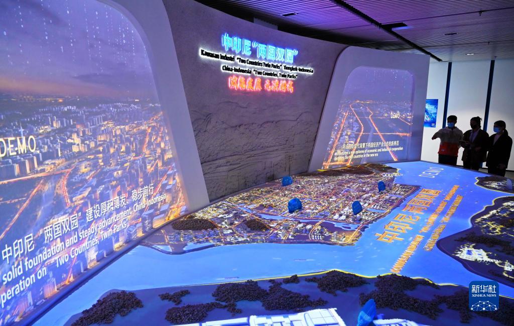 這是2022年11月16日拍攝的福州元洪投資區元洪食品數字經(jīng)濟產(chǎn)業(yè)中心的中印尼“兩國雙園”沙盤(pán)和項目介紹。中印尼“兩國雙園”是以福建福州元洪投資區和印尼的民丹工業(yè)園等園區為載體,探索建立產(chǎn)業(yè)互聯(lián)、設施互通、政策互惠的雙園結對合作機制。