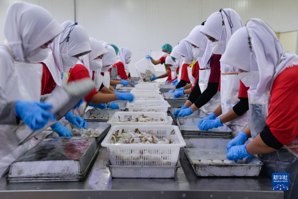 2023年8月29日,在印度尼西亞中爪哇省三寶壟市,工人在福建淼天匯食品有限公司印尼公司的對蝦加工生產(chǎn)線(xiàn)上工作。