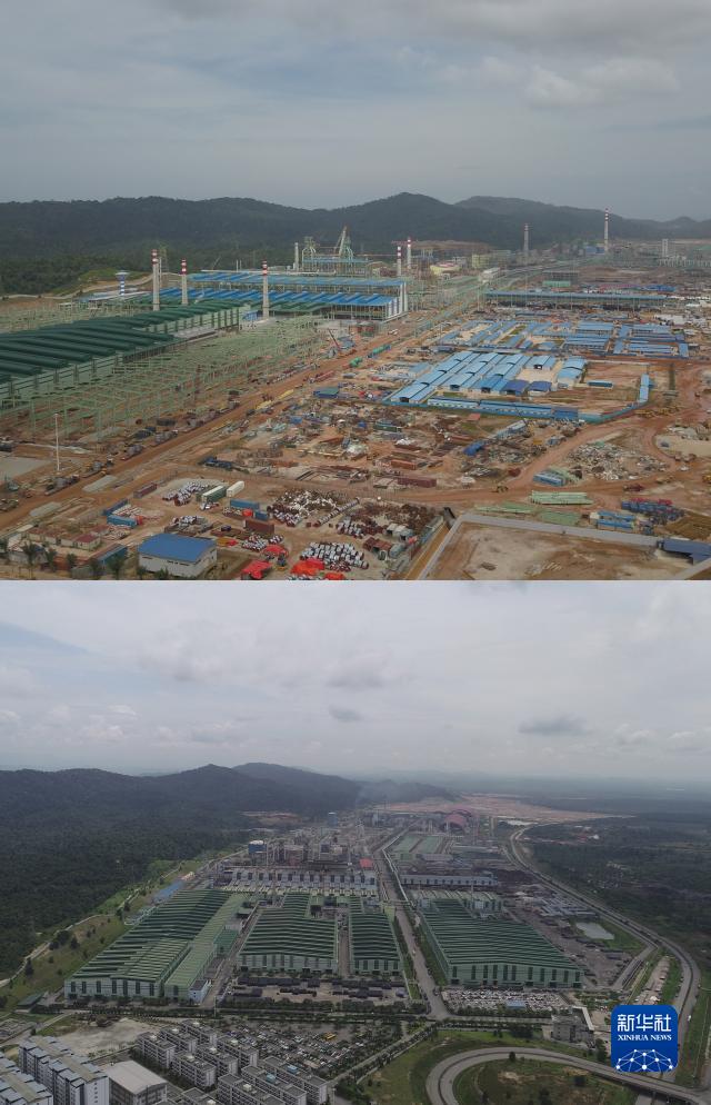 拼版照片顯示,上圖:2017年12月25日拍攝的位于馬來(lái)西亞彭亨州的馬來(lái)西亞-中國關(guān)丹產(chǎn)業(yè)園;下圖:2021年5月18日拍攝的位于馬來(lái)西亞彭亨州的馬來(lái)西亞-中國關(guān)丹產(chǎn)業(yè)園。