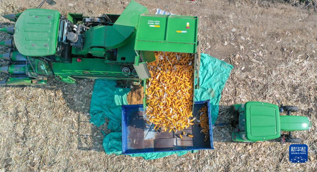 10月11日,在吉林省公主嶺市范家屯鎮乾程農民專(zhuān)業(yè)合作社,農民操作農機收獲玉米(無(wú)人機照片)。