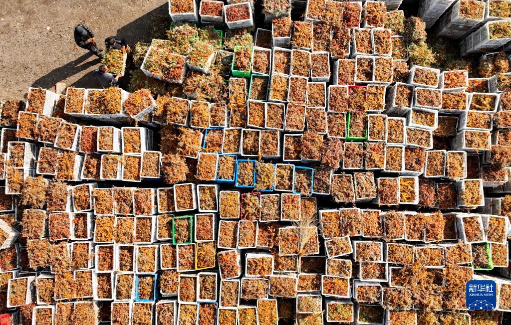 10月11日,沽源縣一家農業(yè)開(kāi)發(fā)企業(yè)的工人在整理收購的沙棘果(無(wú)人機照片)。