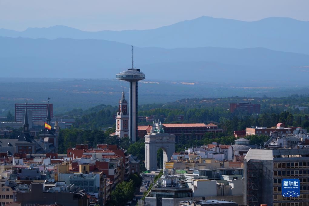 這是7月25日拍攝的西班牙馬德里蒙克洛亞燈塔和凱旋門(mén)。