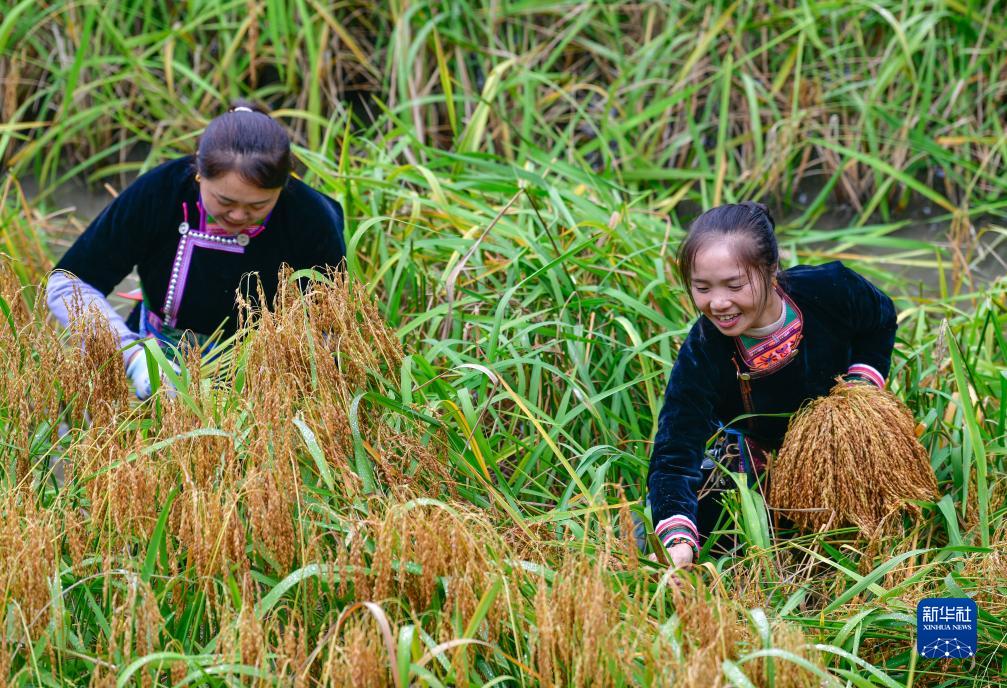 10月11日,村民在貴州省從江縣高增鄉建華村采收香禾糯稻谷。
