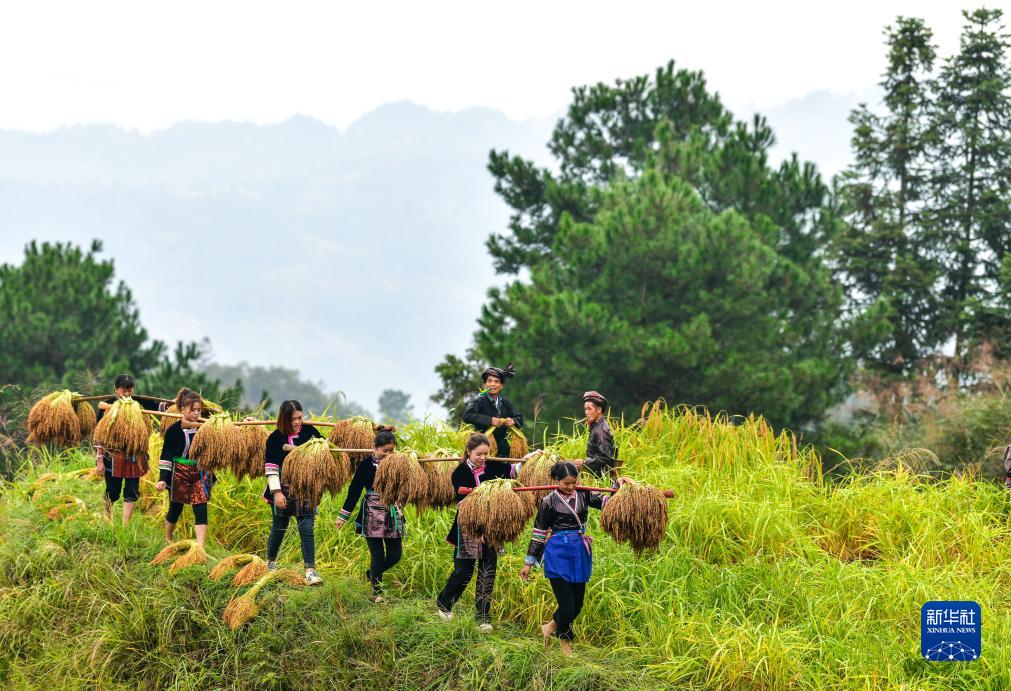 10月11日,村民在貴州省從江縣高增鄉建華村挑運香禾糯稻谷。