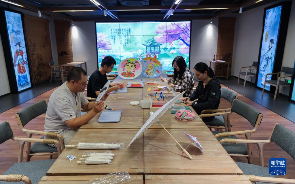 10月11日,游客在大運河數字詩(shī)路e站的互動(dòng)功能區內體驗傳統紙扇繪制。