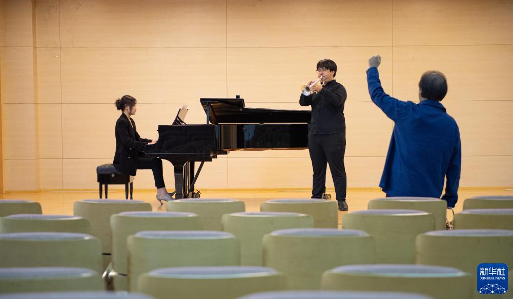 9月14日,中央音樂(lè )學(xué)院小號專(zhuān)業(yè)學(xué)生紀政旭(中)在陳光教授(右)指導下練習吹奏海頓的《降E大調小號協(xié)奏曲》。