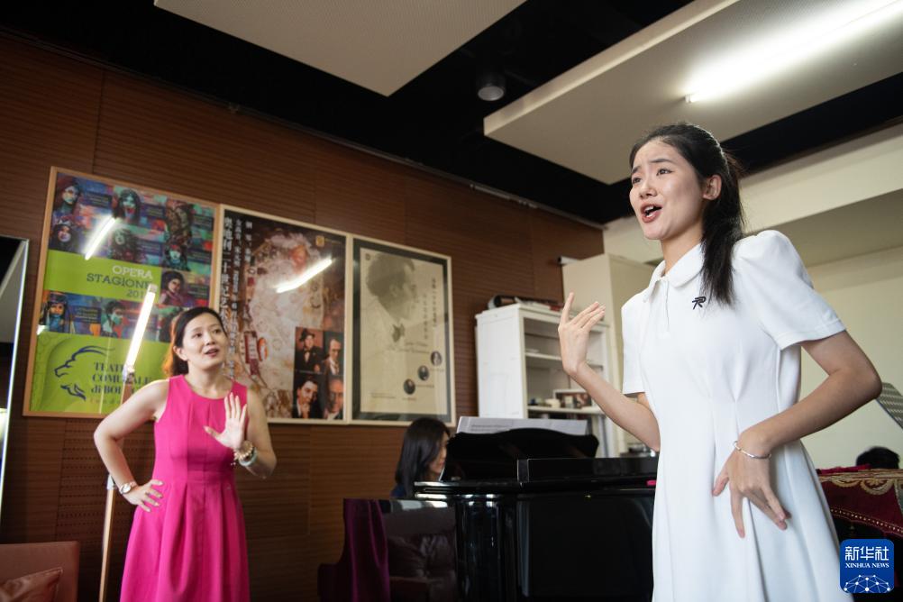 9月14日,中央音樂(lè )學(xué)院聲歌系教授宋元明(左)指導女高音專(zhuān)業(yè)的學(xué)生練習小約翰·施特勞斯的《蝙蝠》選段。