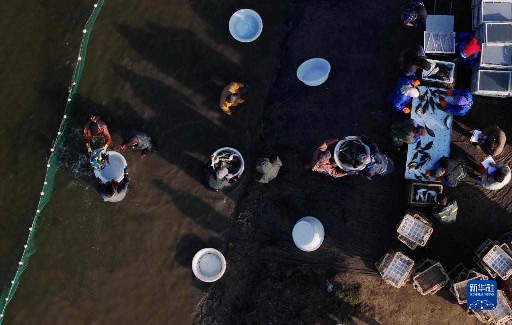 10月11日,唐山市曹妃甸區柳贊鎮一家河豚魚(yú)養殖合作社的社員在池塘捕撈河豚魚(yú)(無(wú)人機照片)。