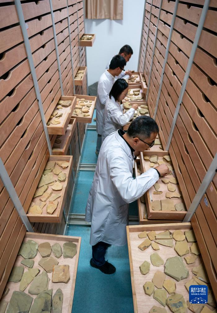 10月11日,云南大學(xué)古生物研究院研究員劉煜(前)帶領(lǐng)學(xué)生在化石存放庫里挑選化石。