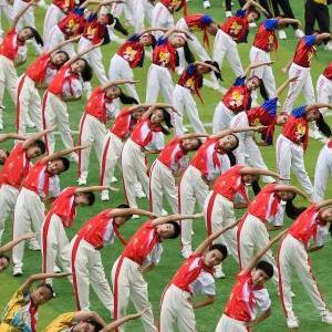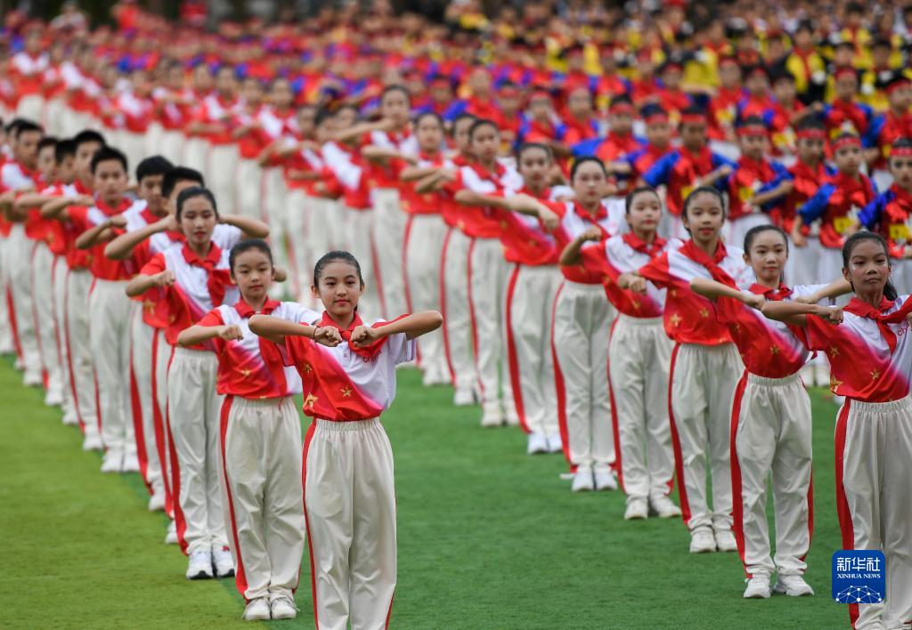 10月11日,參加活動(dòng)的少先隊員表演第三套全國小學(xué)生廣播體操《七彩陽(yáng)光》。