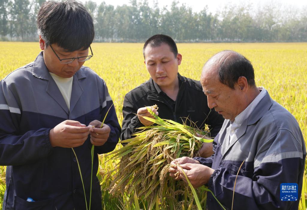 10月11日,農業(yè)科研人員在河北省唐山市曹妃甸區第五農場(chǎng)鹽堿地改良而成的高標準稻田查看稻粒飽滿(mǎn)度。