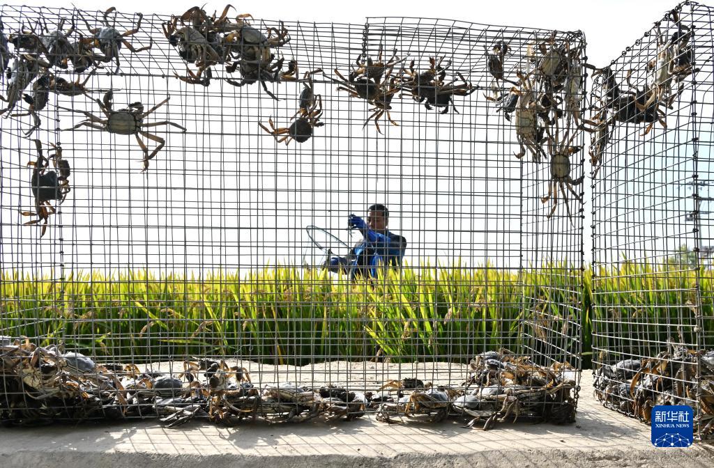 10月11日,河北省唐山市曹妃甸區第四農場(chǎng)的農民在鹽堿地改良而成的稻漁綜合種養田間收獲稻田蟹。