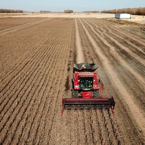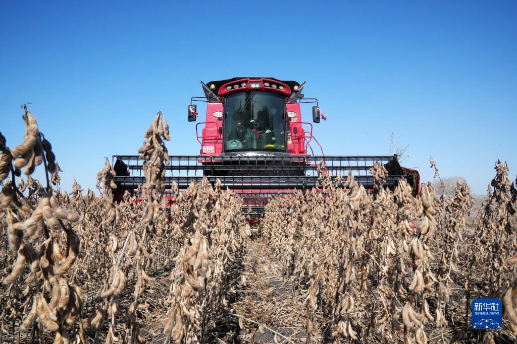 10月11日,收割機在黑龍江省富錦市一大豆地塊收獲大豆。