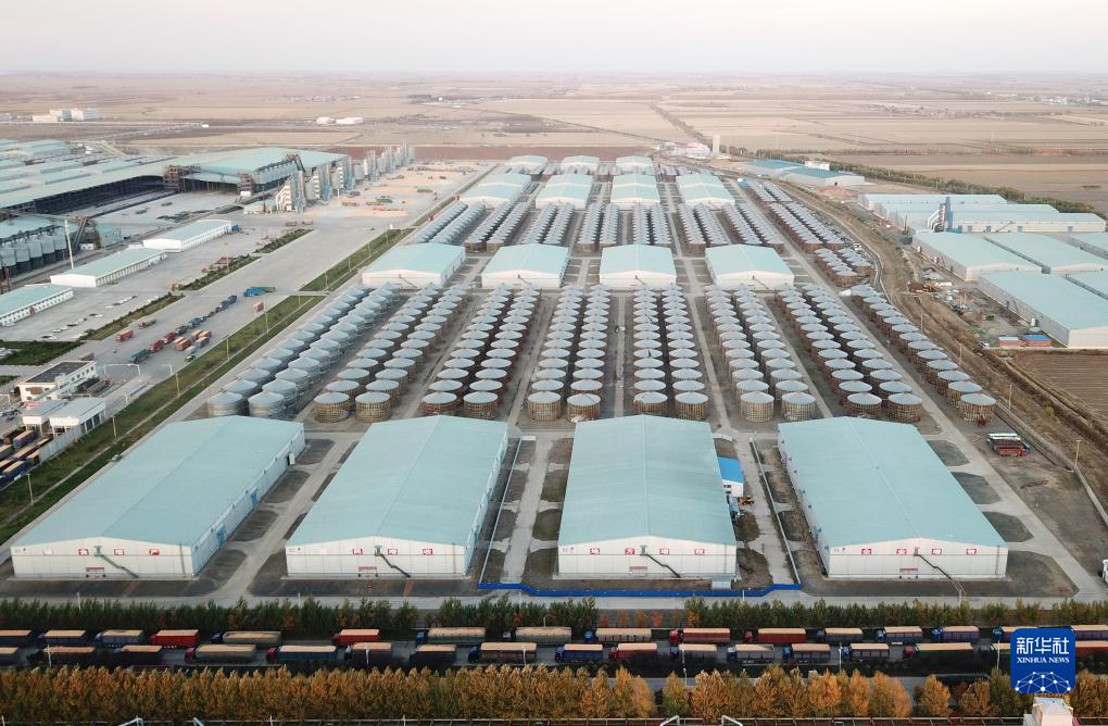 10月11日,送糧車(chē)在黑龍江省富錦市一大型糧食倉儲加工企業(yè)外排起長(cháng)隊(無(wú)人機照片)。