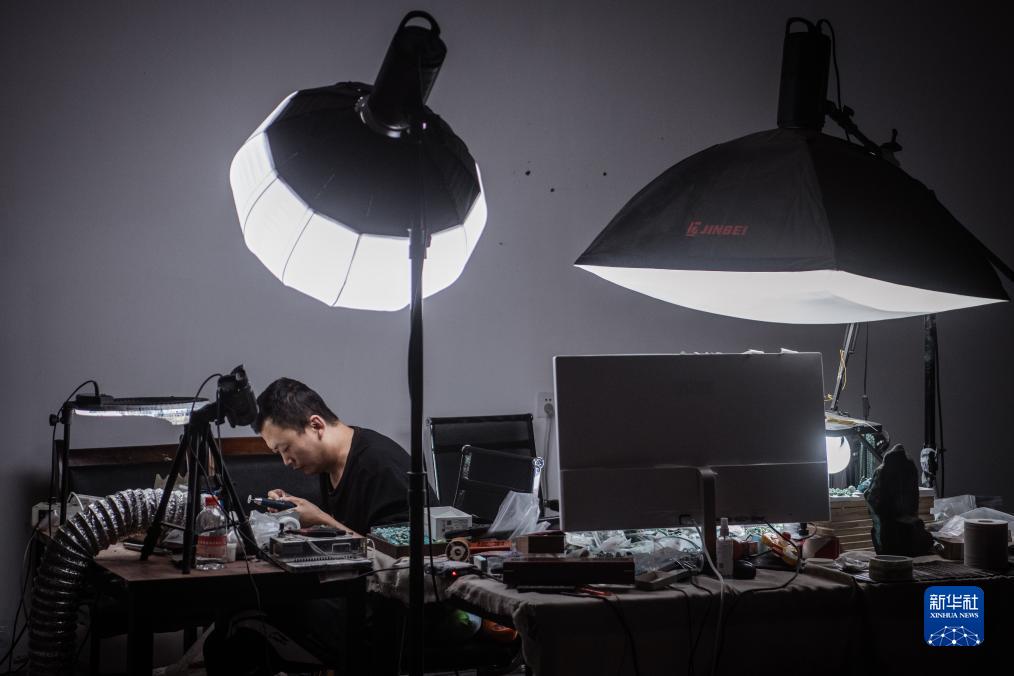 10月11日,湖北省鄖西縣下?tīng)I村村民鐘磊在直播綠松石精加工過(guò)程。